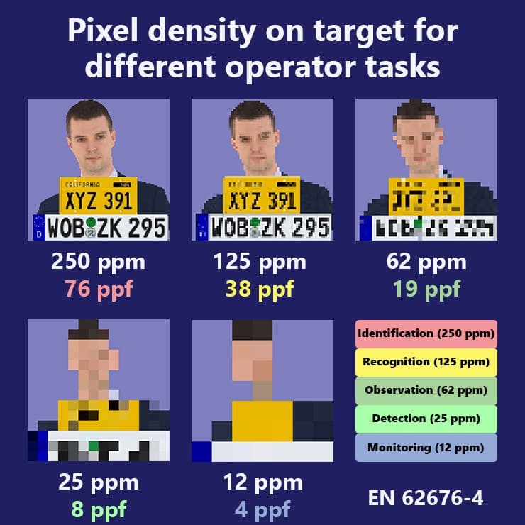 Gyakran előforduló hiba, hogy nem a megfelelő eszköz kerül kiválasztásra. Rendszerint ezekhez a kamerákhoz már a gyár által támogatott szoftververziók sem érhetők el, így a biztonsági frissítések sem lesznek naprakészek. Meg kell győződnünk arról, hogy az adott kamera biztosan tudja -e teljesíteni az elvárt igényeket. Pixelsűrűségi követelmények szerint megkülönböztetünk 6 osztályt.